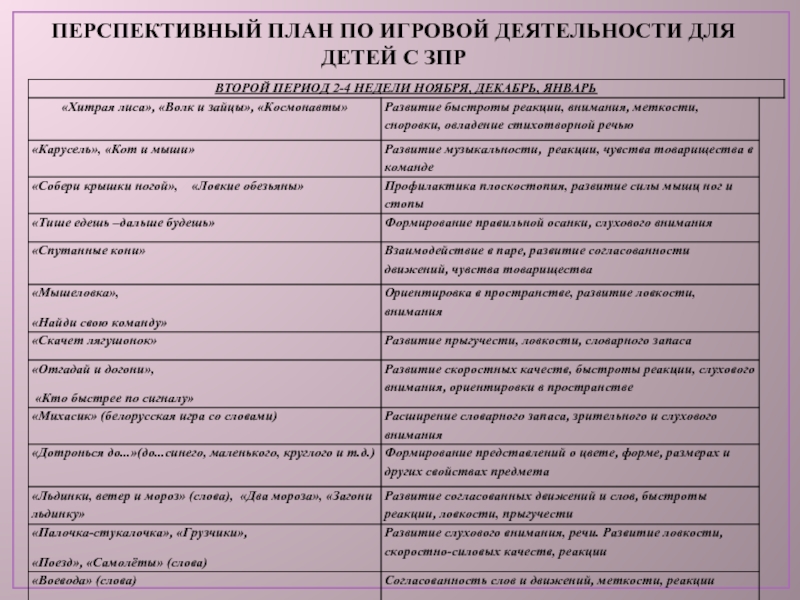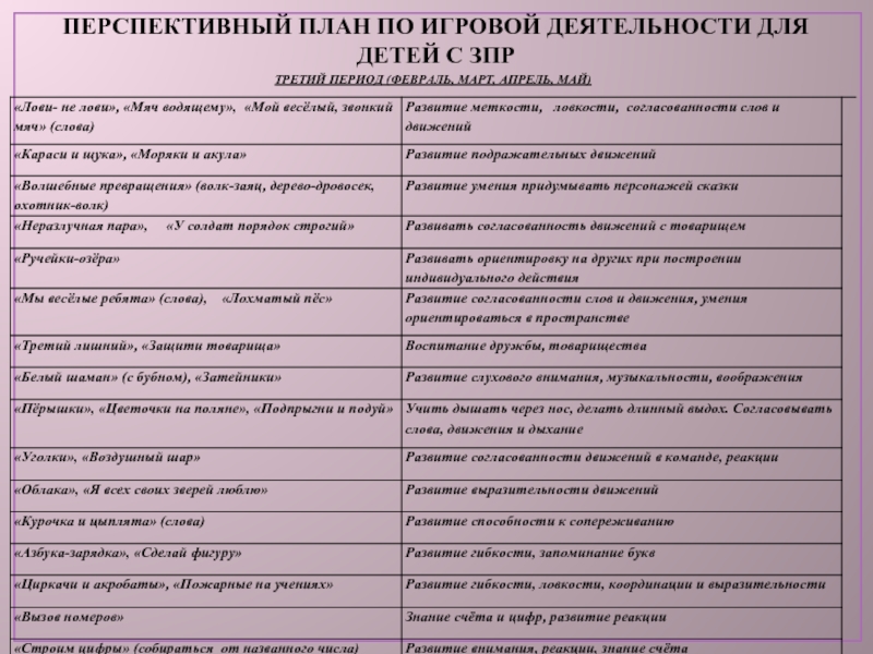 Слайд 25ПЕРСПЕКТИВНЫЙ ПЛАН ПО ИГРОВОЙ ДЕЯТЕЛЬНОСТИ ДЛЯ ДЕТЕЙ С ЗПР