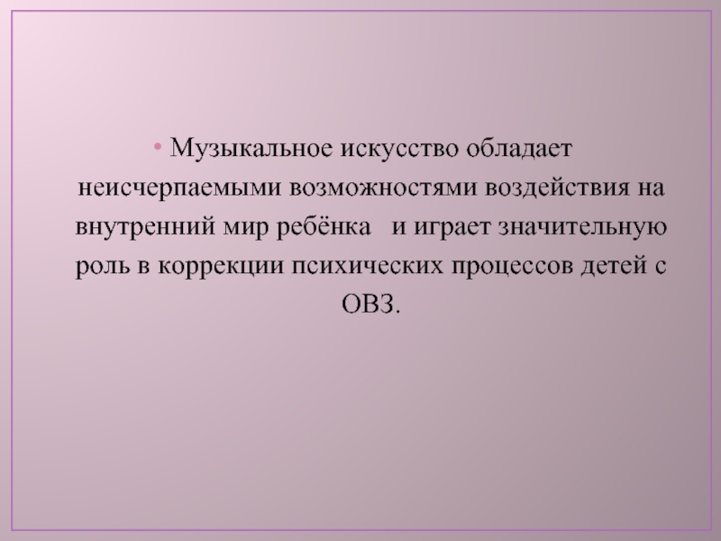 Музыкальное искусство обладает неисчерпаемыми возможностями воздействия на внутренний мир ребёнка