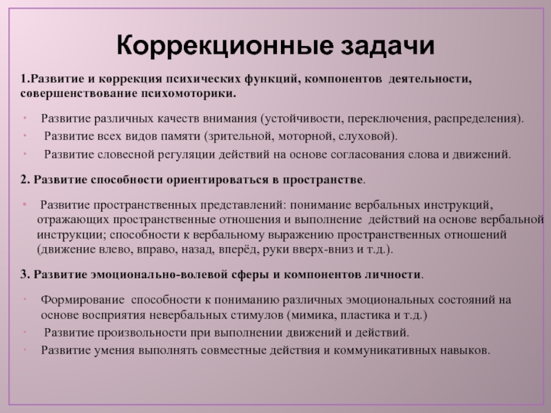 1.Развитие и коррекция психических функций, компонентов деятельности, совершенствование психомоторики.