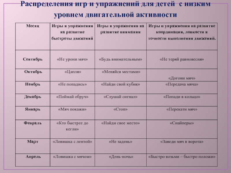 Слайд 29Распределения игр и упражнений для детей с низким уровнем двигательной активности