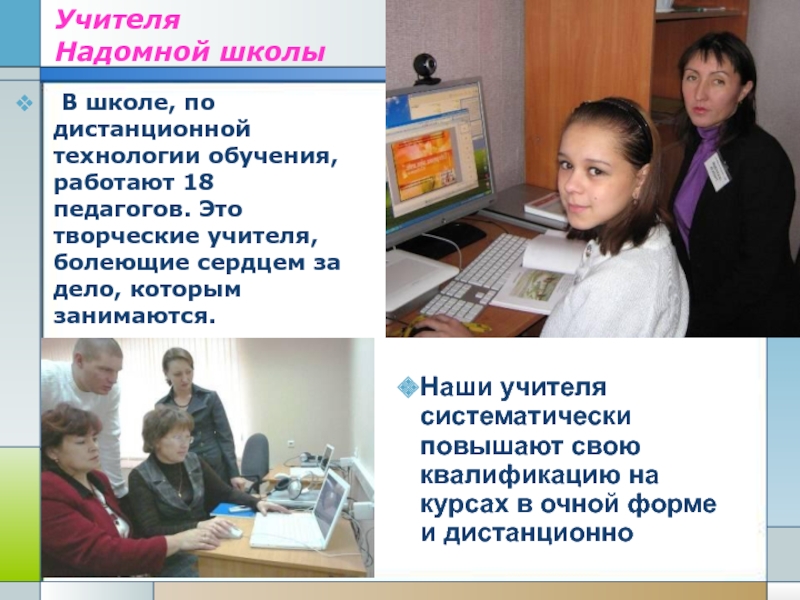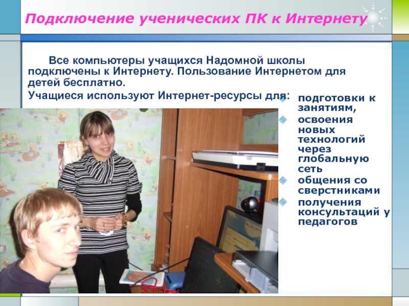 Все компьютеры учащихся Надомной школы подключены к Интернету. Пользование Интернетом для детей бесплатно.