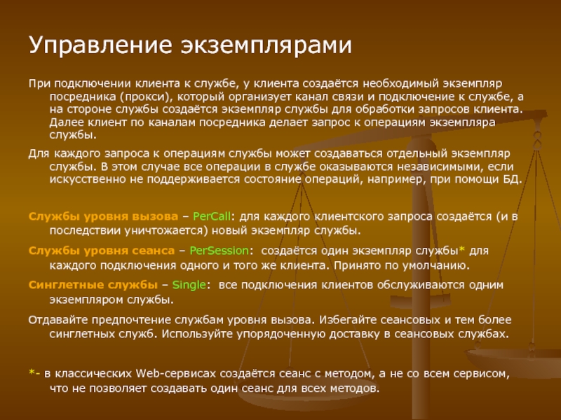 Синглетные службы плохо масштабируются. В любой момент времени с синглетом может работать только один клиент. Такое ограничение снижает производитель-ность, скорость отклика и доступа. Например, если операция с синглетом занимает 0.1 секунды, служба сможет обслуживать только 10 клиентов в секунду. При большем количестве клиентов (20 или 100) производительность системы становится неприемлемой.