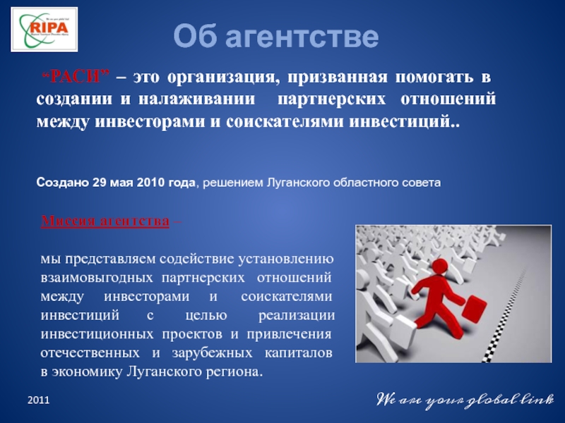 “РАСИ” – это организация, призванная помогать в создании и налаживании партнерских отношений между инвесторами и соискателями инвестиций..
