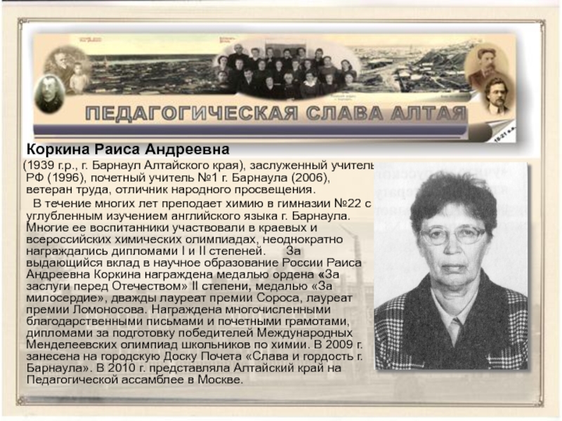 Барнаул Алтайского края), заслуженный учитель РФ (1996), почетный учитель №1 г. Барнаула (2006), ветеран труда, отличник народного просвещения.