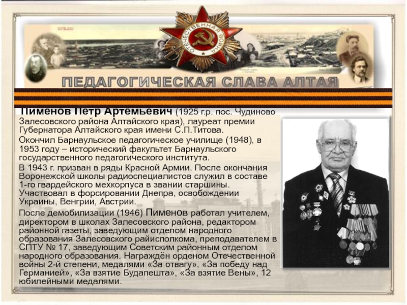 Слайд 33 Пименов Петр Артемьевич (1925 г.р. пос. Чудиново Залесовского