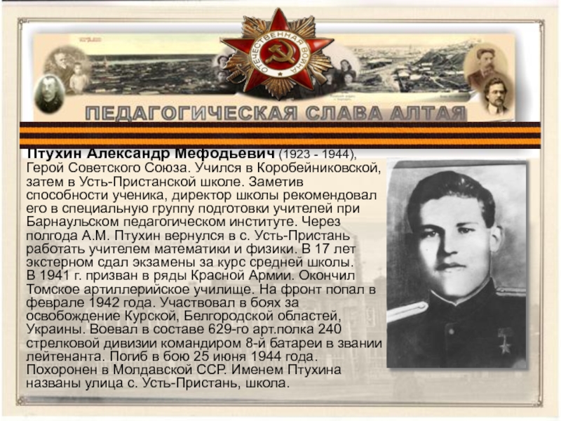 1944), Герой Советского Союза. Учился в Коробейниковской, затем в Усть-Пристанской школе. Заметив способности ученика, директор школы рекомендовал его в специальную группу подготовки учителей при Барнаульском педагогическом институте. Через полгода А.М. Птухин вернулся в с. Усть-Пристань работать учителем математики и физики. В 17 лет экстерном сдал экзамены за курс средней школы.
