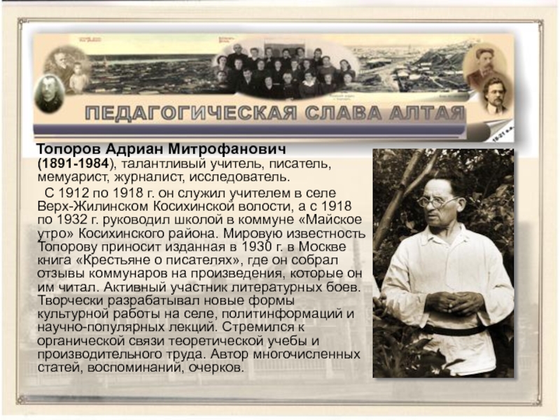 Слайд 21В альбоме представлены материалы о выдающихся педагогах Алтайского края, участвовавших в