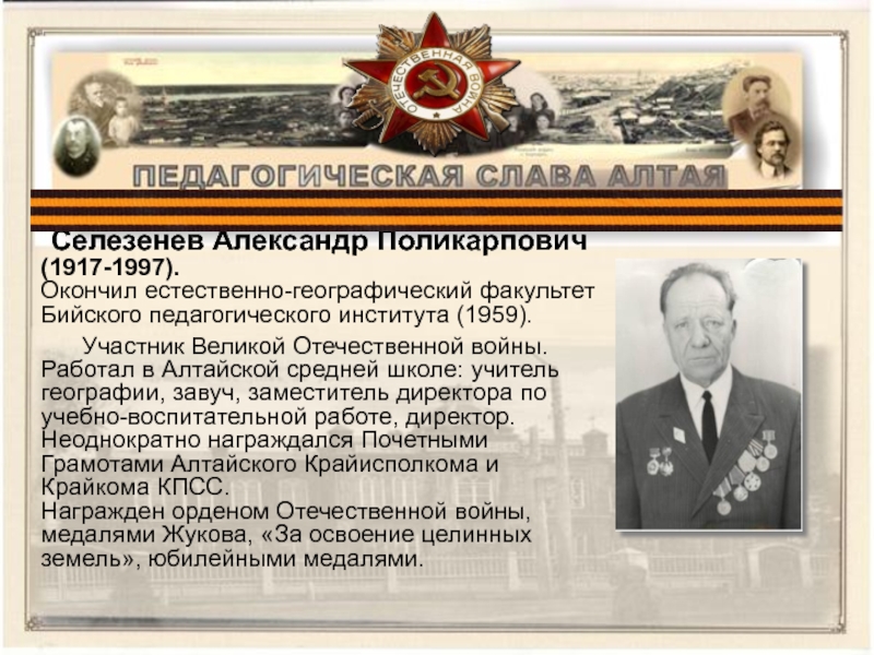 Великой Отечественной войны, заслуженный учитель школы РСФСР. В 1938 г. окончил Бийское педучилище. Был назначен учителем географии в Петропавловскую семилетнюю школу. В 1939 г. призван в ряды Красной Армии. Учился в военном училище. Воевал на Юго-Западном фронте.