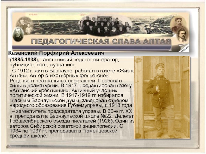 – заместитель председателя управы. В 20-е гг. XX в. преподавал в Барнаульской школе №22. Делегат I общесибирского съезда писателей (1926). Один из авторов Сибирской советской энциклопедии. С 1934 по 1937 гг. преподавал в Тюменцевской средней школе.