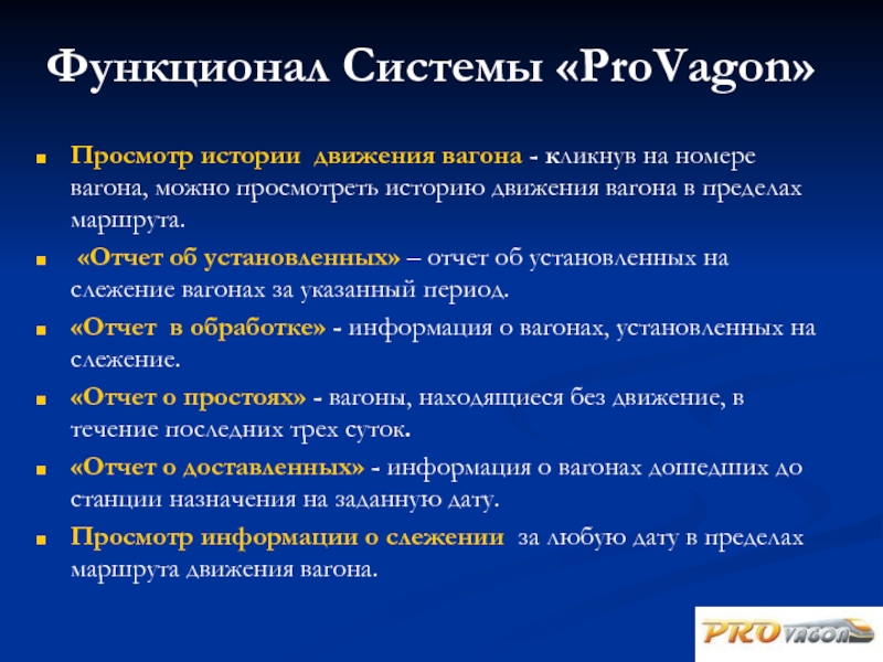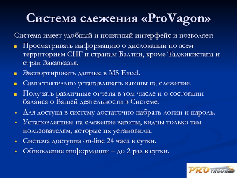 Слежение по маршруту – с помощью логина и пароля к системе «ProVagon» вы ставите вагон/контейнер на определение дислокации и через некоторое время получаете данные о его местонахождении. Вагон/контейнер автоматически снимается со слежения, как только достигнет станции назначения. Информация по дислокации обновляется 2 раза в день без выходных и без праздников.