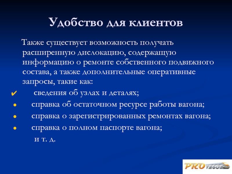 информацию о ремонте собственного подвижного состава, а также дополнительные оперативные запросы, такие как: