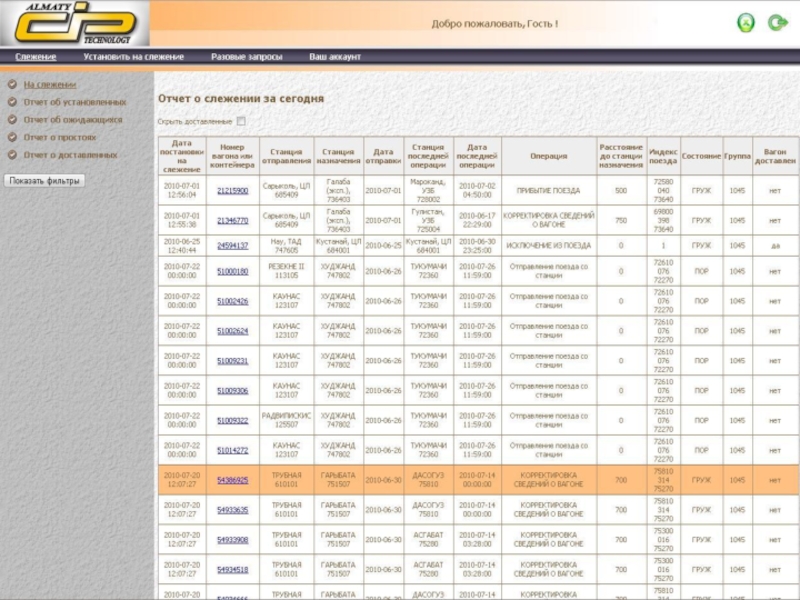 «Отчет о доставленных» - информация о вагонах дошедших до станции назначения на заданную дату.