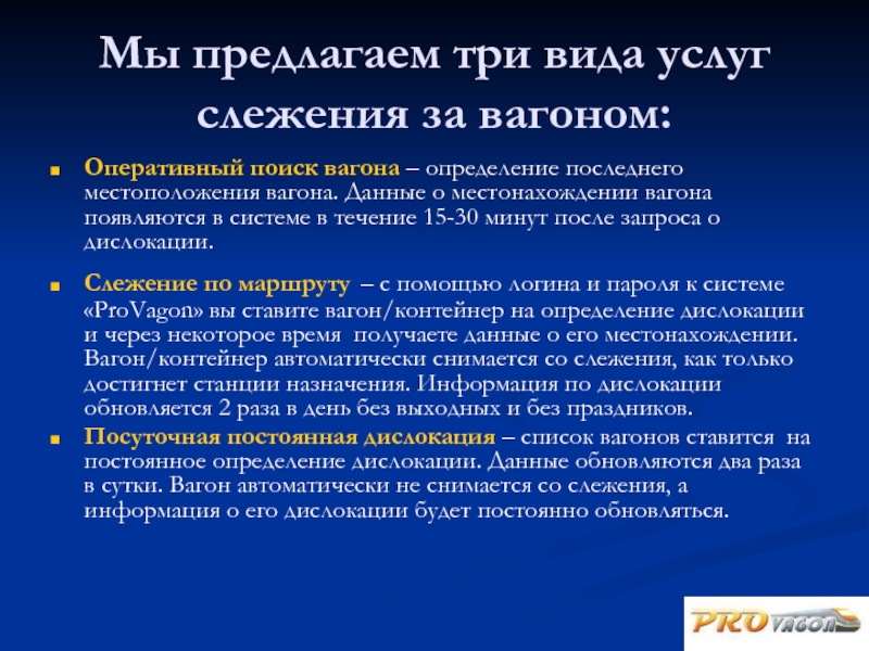 Слайд 2Мы предлагаем три вида услуг слежения за вагоном: