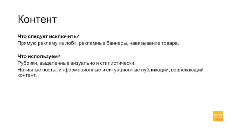 Нативные посты, информационные и ситуационные публикации, вовлекающий контент.