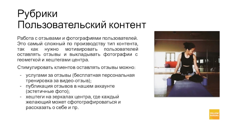 производству тип контента, так как нужно мотивировать пользователей оставлять отзывы и выкладывать фотографии с геометкой и хештегами центра.
