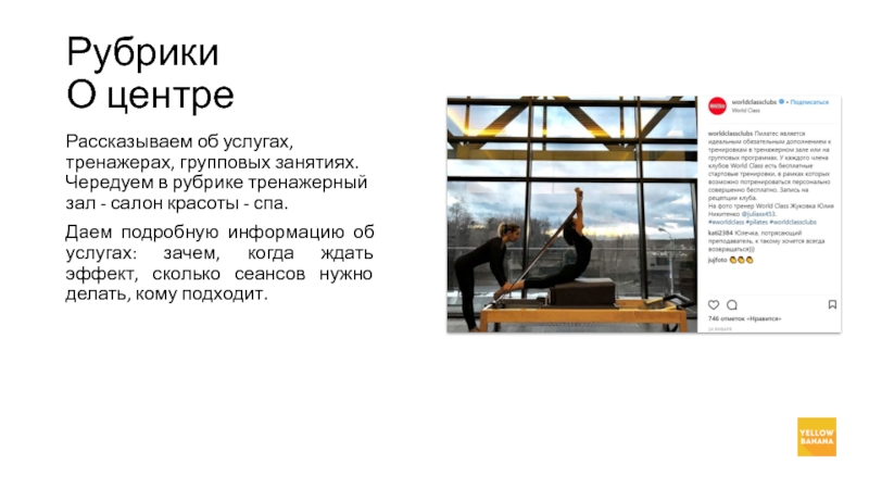 Рассказываем об услугах, тренажерах, групповых занятиях. Чередуем в рубрике тренажерный