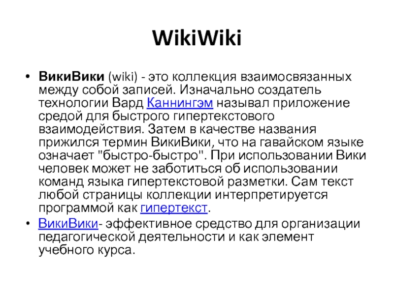 ВикиВики (wiki) - это коллекция взаимосвязанных между собой записей. Изначально создатель