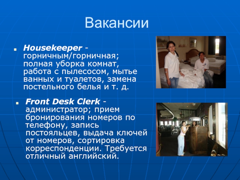 Front Desk Clerk - администратор; прием бронирования номеров по телефону, запись постояльцев, выдача ключей от номеров, сортировка корреспонденции. Требуется отличный английский.