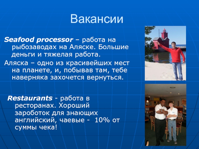 Restaurants - работа в ресторанах. Хороший зароботок для знающих английский, чаевые - 10% от суммы чека!