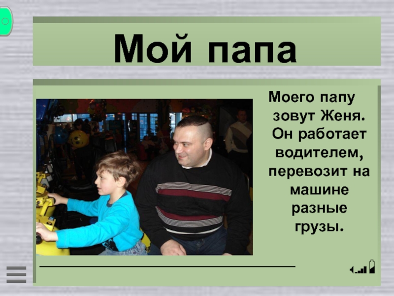 Моего папу зовут Женя. Он работает водителем, перевозит на машине
