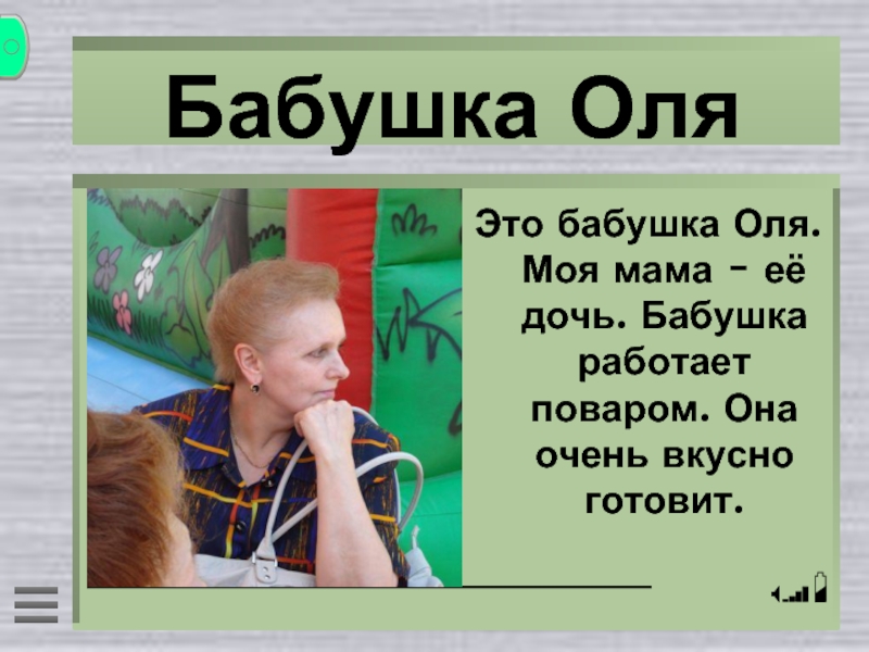Это бабушка Оля. Моя мама - её дочь. Бабушка работает