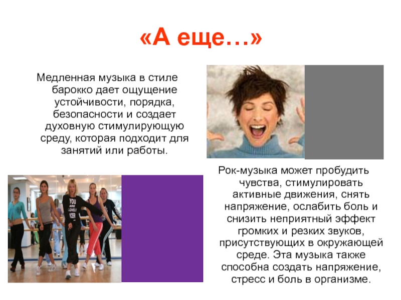 Рок-музыка может пробудить чувства, стимулировать активные движения, снять напряжение, ослабить боль и снизить неприятный эффект громких и резких звуков, присутствующих в окружающей среде. Эта музыка также способна создать напряжение, стресс и боль в организме.