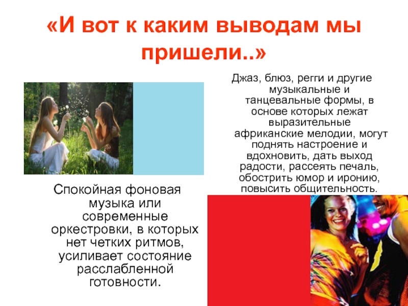 Джаз, блюз, регги и другие музыкальные и танцевальные формы, в основе которых лежат выразительные африканские мелодии, могут поднять настроение и вдохновить, дать выход радости, рассеять печаль, обострить юмор и иронию, повысить общительность.