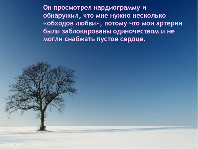 Он просмотрел кардиограмму и обнаружил, что мне нужно несколько «обходов любви», потому что мои артерии были заблокированы одиночеством и не могли снабжать пустое сердце.