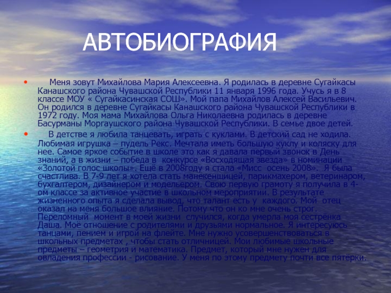 Меня зовут Михайлова Мария Алексеевна. Я родилась в деревне Сугайкасы Канашского района Чувашской Республики 11 января 1996 года. Учусь я в 8 классе МОУ « Сугайкасинская СОШ». Мой папа Михайлов Алексей Васильевич. Он родился в деревне Сугайкасы Канашского района Чувашской Республики в 1972 году. Моя мама Михайлова Ольга Николаевна родилась в деревне Басурманы Моргаушского района Чувашской Республики. В семье двое детей.