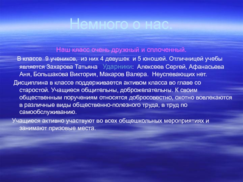 классе 9 учеников, из них 4 девушек и 5 юношей. Отличницей учебы является Захарова Татьяна. Ударники: Алексеев Сергей, Афанасьева Аня, Большакова Виктория, Макаров Валера. Неуспевающих нет.