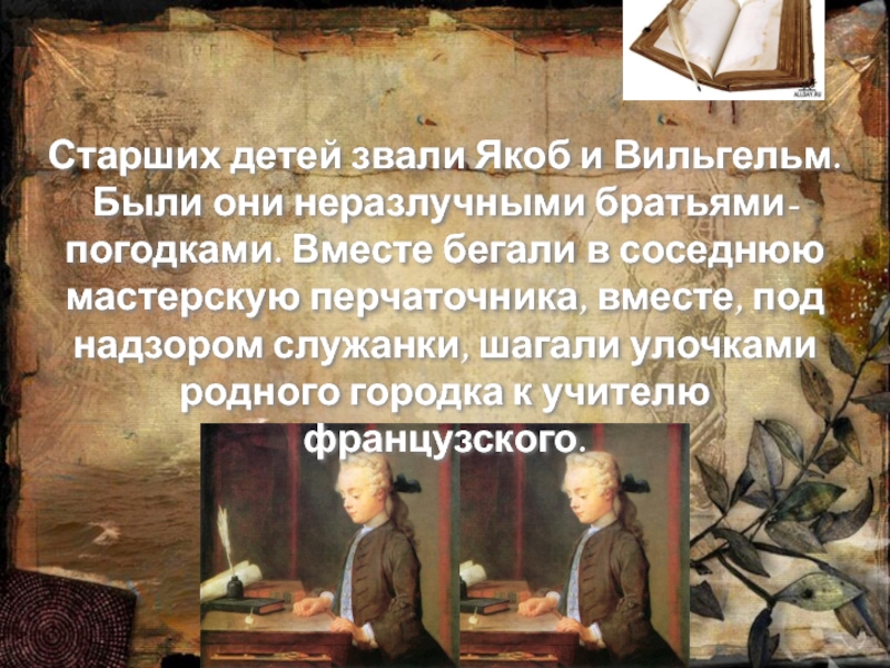 Слайд 3Старших детей звали Якоб и Вильгельм. Были они неразлучными братьями-погодками. Вместе
