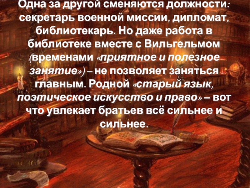 даже работа в библиотеке вместе с Вильгельмом (временами «приятное и полезное занятие») – не позволяет заняться главным. Родной «старый язык, поэтическое искусство и право» – вот что увлекает братьев всё сильнее и сильнее.