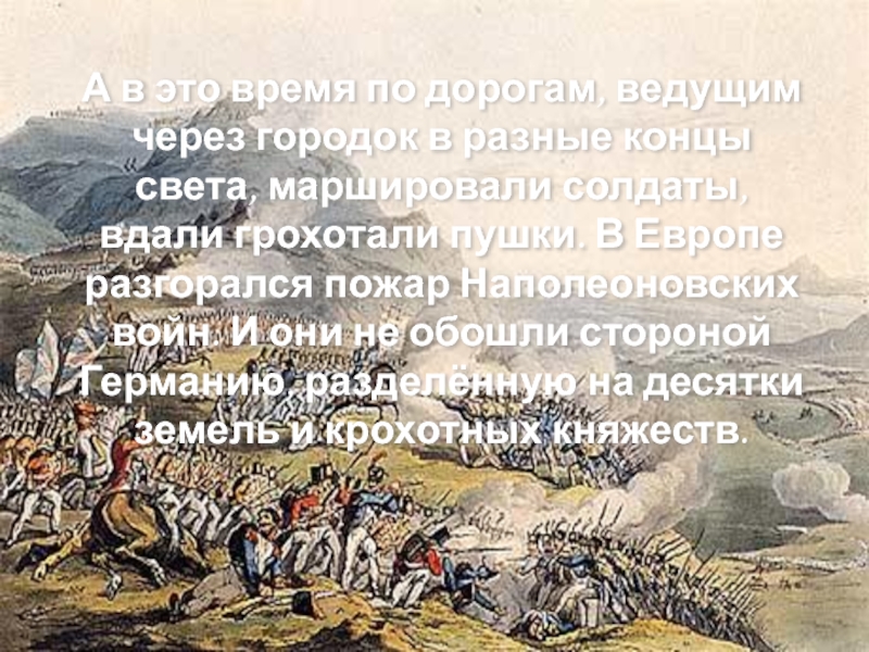концы света, маршировали солдаты, вдали грохотали пушки. В Европе разгорался пожар Наполеоновских войн. И они не обошли стороной Германию, разделённую на десятки земель и крохотных княжеств.