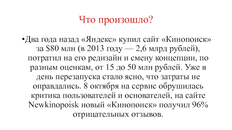 (в 2013 году — 2,6 млрд рублей), потратил на его редизайн и смену концепции, по разным оценкам, от 15 до 50 млн рублей. Уже в день перезапуска стало ясно, что затраты не оправдались. 8 октября на сервис обрушилась критика пользователей и основателей, на сайте Newkinopoisk новый «Кинопоиск» получил 96% отрицательных отзывов.