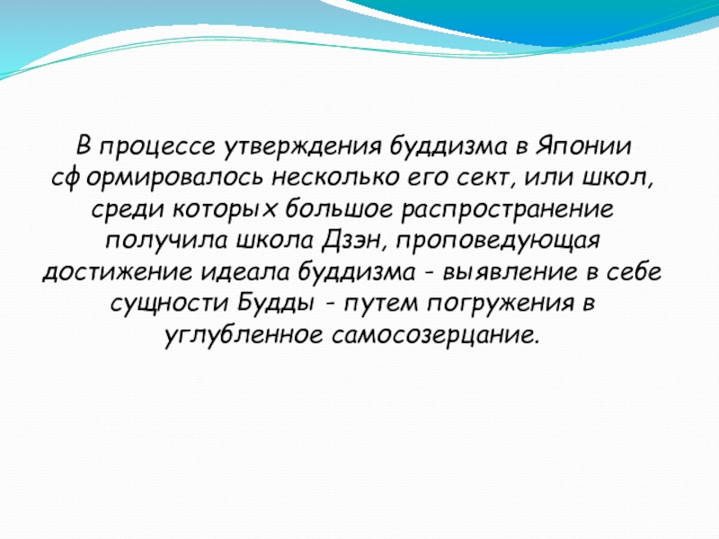 сект, или школ, среди которых большое распространение получила школа Дзэн, проповедующая достижение идеала буддизма - выявление в себе сущности Будды - путем погружения в углубленное самосозерцание.