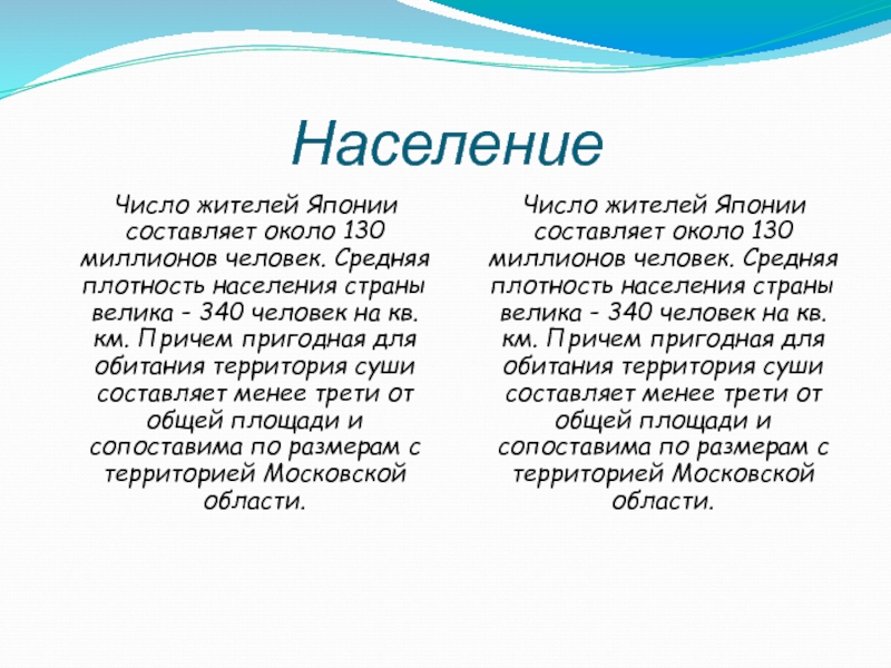 Число жителей Японии составляет около 130 миллионов человек. Средняя плотность населения страны велика - 340 человек на кв.км. Причем пригодная для обитания территория суши составляет менее трети от общей площади и сопоставима по размерам с территорией Московской области.