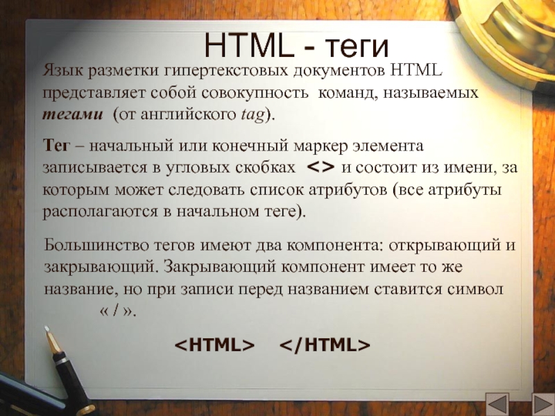 Большинство тегов имеют два компонента: открывающий и закрывающий. Закрывающий компонент имеет то же название, но при записи перед названием ставится символ « / ».