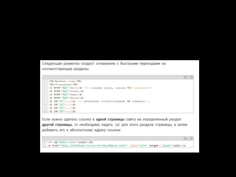Слайд 30Якоря, или внутренние ссылки, создают переходы на различные разделы текущей веб-страницы,