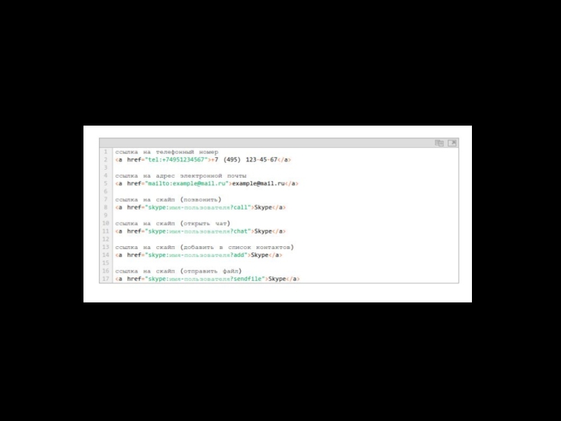 HTTP: http://www.site.ru/ https — специальная реализация протокола HTTP, использующая шифрование (как правило, SSL или TLS) https://www.site.ru/ ftp осуществляет запрос к FTP-серверу на получение файла: ftp://pgu/directory/library mailto запускает сеанс почтовой связи с указанным адресатом и хостом: mailto: nika@gmail.com Имя сервера описывает полное имя машины в сети, например, www.site.ru. Если имя сервера не указано, то ссылка считается локальной, т.е. она относится к той же машине, на которой находится html-документ, содержащий ссылку. Номер порта ТСР, на котором функционирует веб-сервер. Представляет собой число, которое необходимо указывать, если метод требует номер порта (отдельные сервера могут иметь свой отличительный номер порта). Если порт не указан, по умолчанию используется порт 80. Стандартными портами являются: 21 — FTP 23 — Telnet 70 — Gopher 80 — HTTP Путь содержит имя папки, в которой находится файл.
