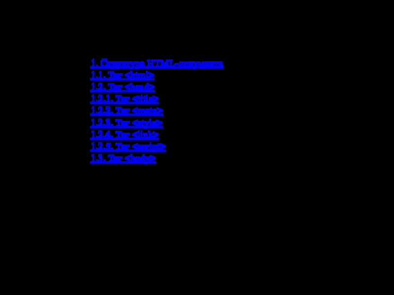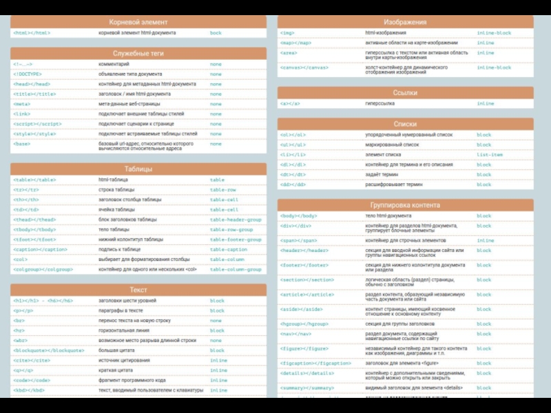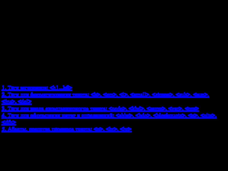 1. Теги заголовков: 2. Теги для форматирования текста: , , , , , , , , 3. Теги для ввода «компьютерного» текста: , , , ,