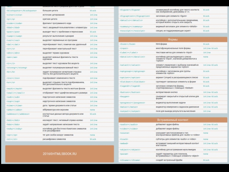 Выделяет цитаты внутри документа, выделяя его отступами и переносами строк. Для тега доступен атрибут cite. 4.5. Тег Используется для выделения коротких цитат. Браузерами заключается в кавычки. Для тега доступен атрибут cite. 4.6. Тег Применяется для выделения цитат, названий произведений, сносок на другие документы. Для тега доступны глобальные атрибуты. 4.7. Тег Позволяет выделить текст как определение. Несмотря на наличие специального тега, рекомендуется выделять текст силами CSS. Для тега доступен атрибут title.