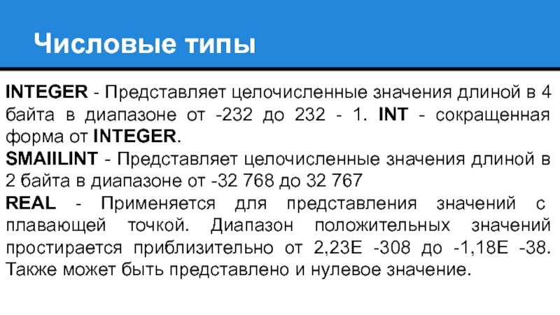 INTEGER - Представляет целочисленные значения длиной в 4 байта в