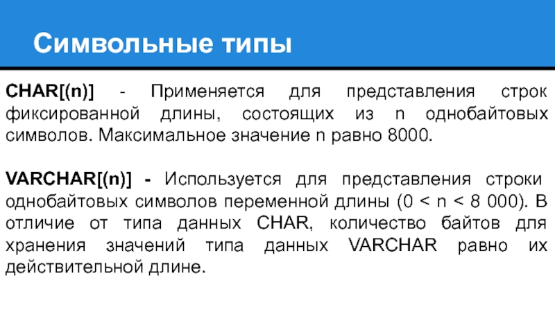 VARCHAR[(n)] - Используется для представления строки однобайтовых символов переменной длины (0 < n < 8 000). В отличие от типа данных CHAR, количество байтов для хранения значений типа данных VARCHAR равно их действительной длине.
