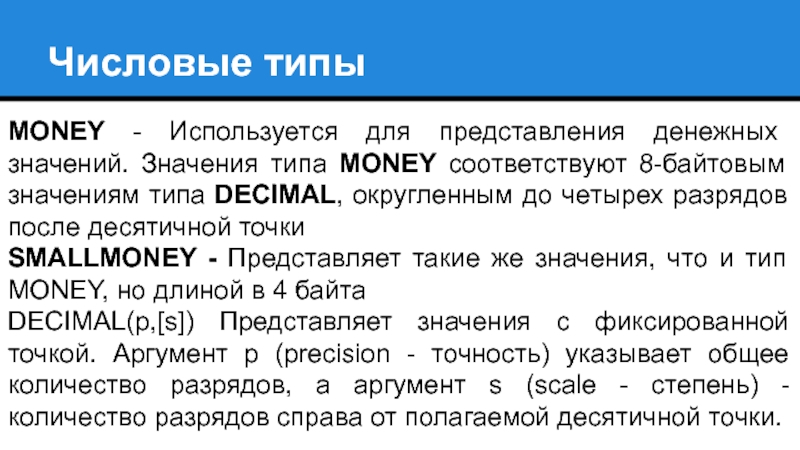 MONEY - Используется для представления денежных значений. Значения типа MONEY