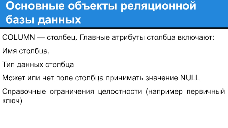 COLUMN — столбец. Главные атрибуты столбца включают: