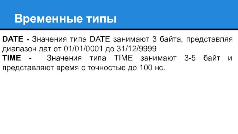 TIME - Значения типа TIME занимают 3-5 байт и представляют время с точностью до 100 нс.