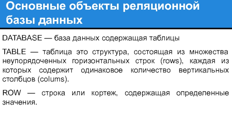 таблица это структура, состоящая из множества неупорядоченных горизонтальных строк (rows), каждая из которых содержит одинаковое количество вертикальных столбцов (colums).