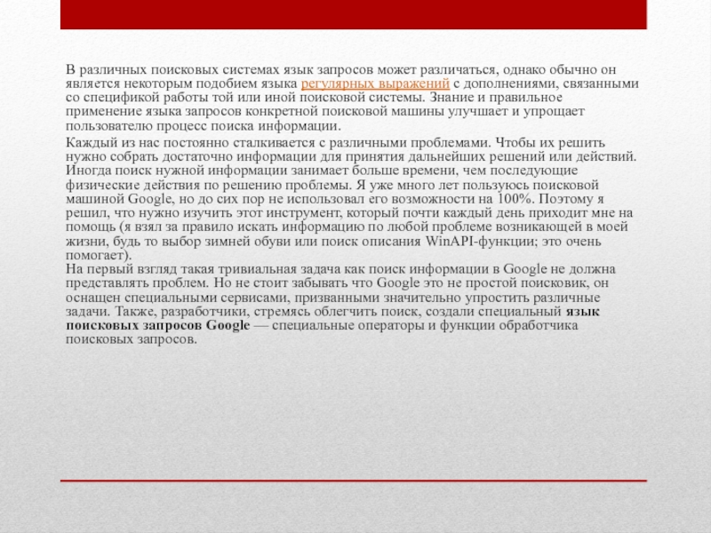 является некоторым подобием языка регулярных выражений с дополнениями, связанными со спецификой работы той или иной поисковой системы. Знание и правильное применение языка запросов конкретной поисковой машины улучшает и упрощает пользователю процесс поиска информации.