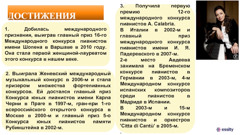 3. Получила первую премию 12-го международного конкурса пианистов A. Calabria.