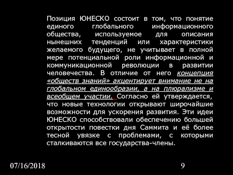 используемое для описания нынешних тенденций или характеристики желаемого будущего, не учитывает в полной мере потенциальной роли информационной и коммуникационной революции в развитии человечества. В отличие от него концепция «обществ знаний» акцентирует внимание не на глобальном единообразии, а на плюрализме и всеобщем участии. Согласно ей утверждается, что новые технологии открывают широчайшие возможности для ускорения развития. Эти идеи ЮНЕСКО способствовали обеспечению большей открытости повестки дня Саммита и её более тесной увязке с проблемами, с которыми сталкиваются все государства-члены.